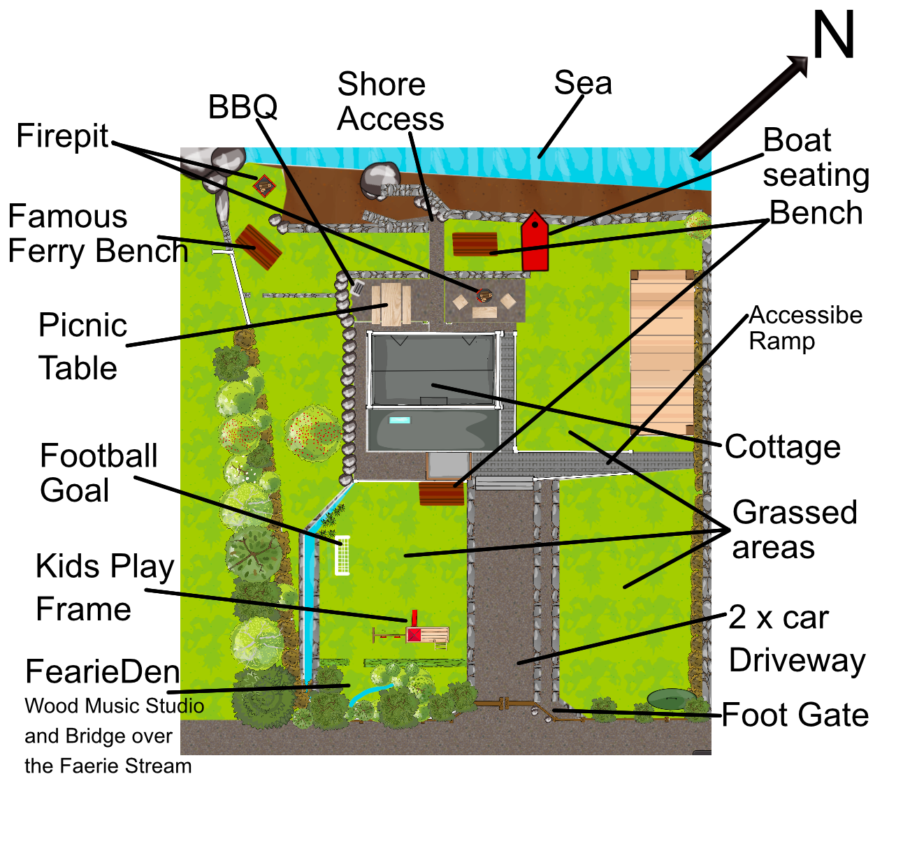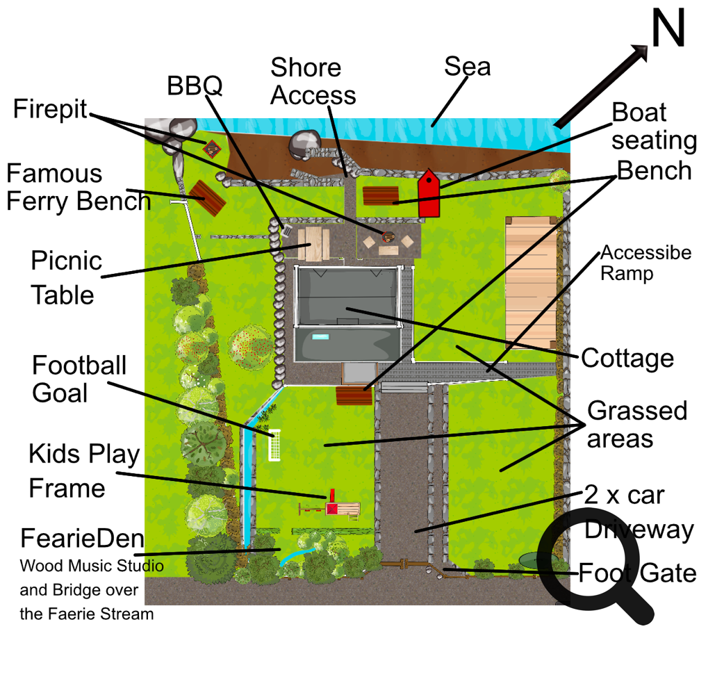 • Kids ‘Faerie den’ with stream, tree seating and wooden bridge.